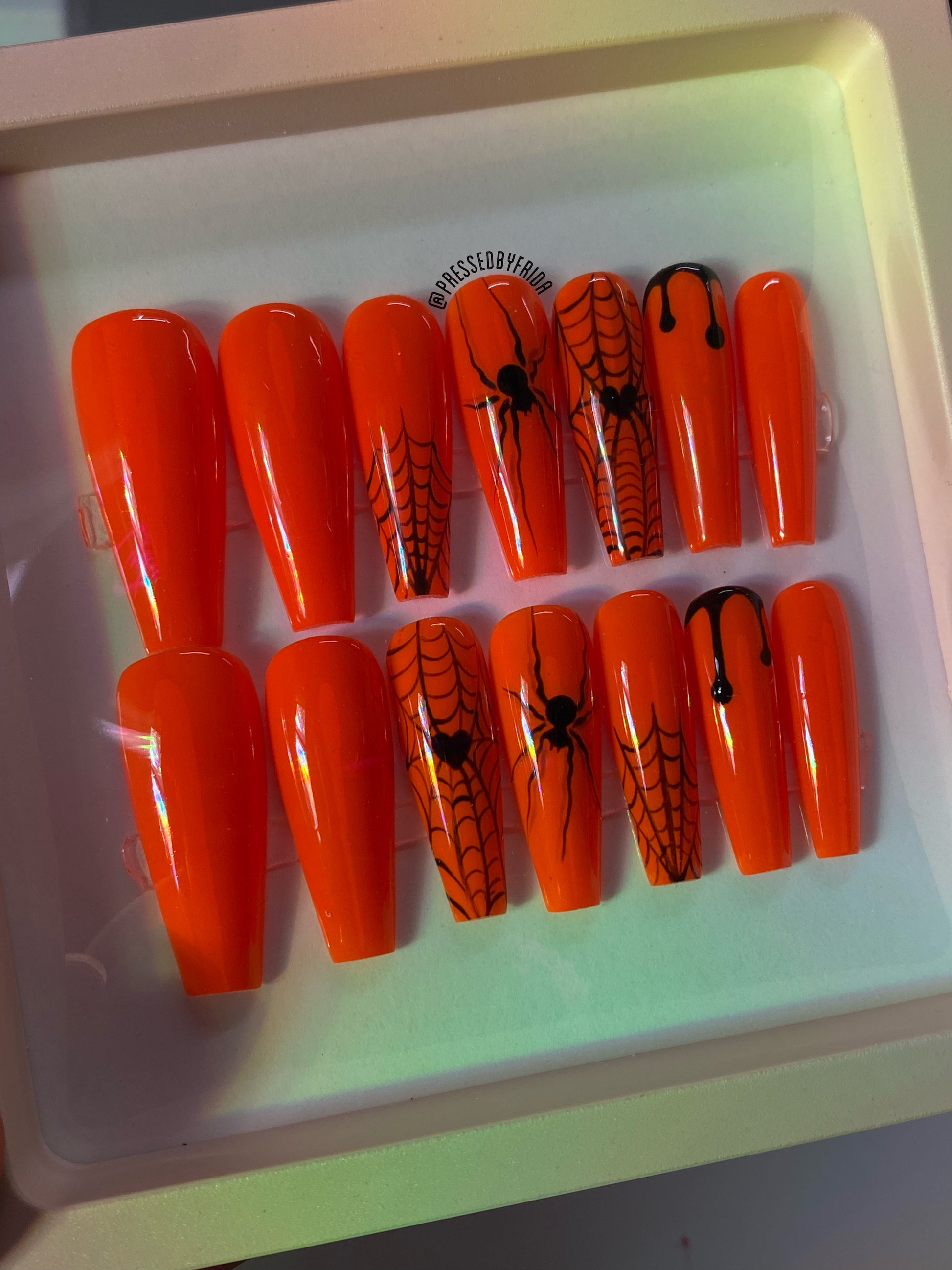 All hand painted with gel polish; this 14PC set includes it’s very own frame packaging display and an application kit as well as application & removal instructions, should you choose to wear these spooky one of a kind nails.